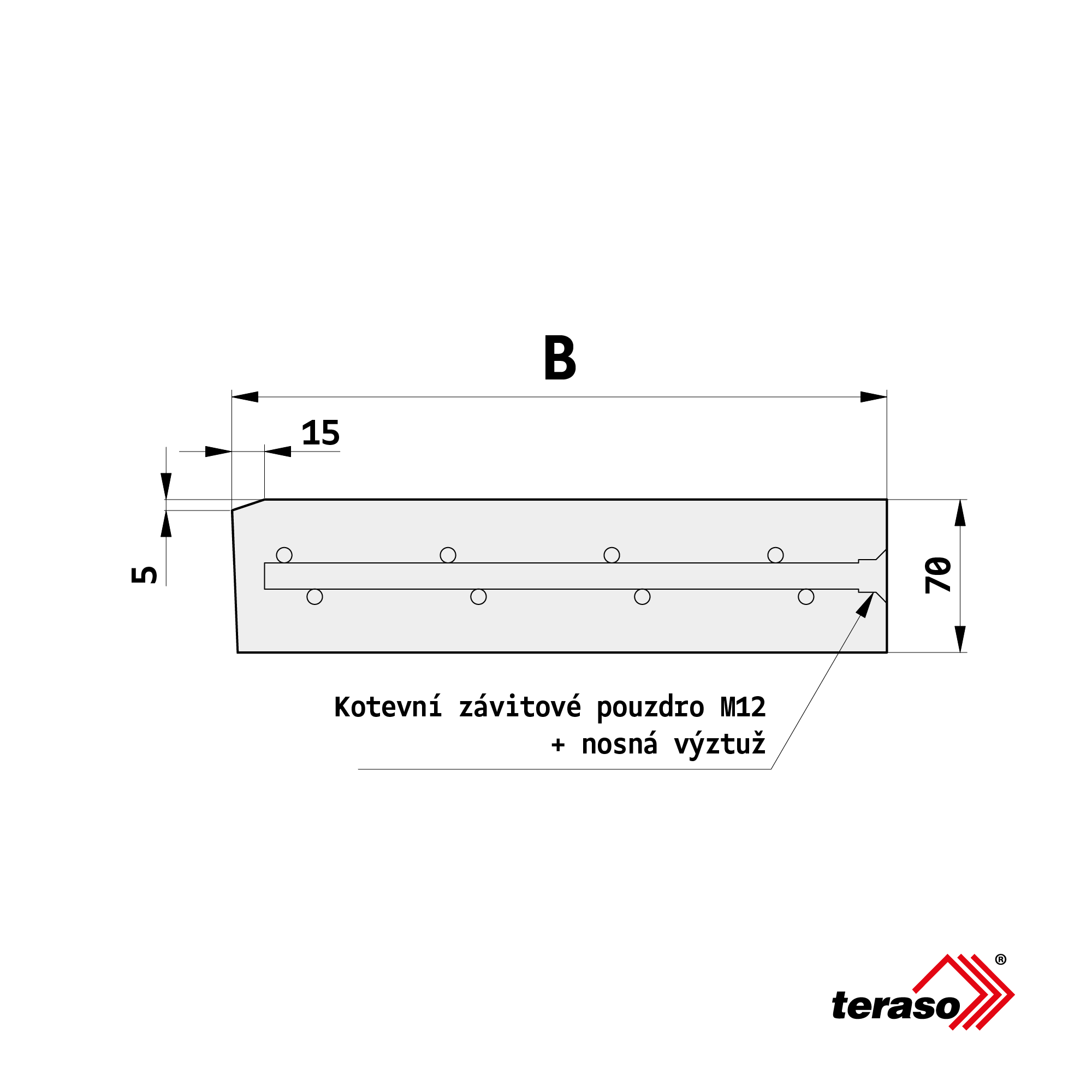 Prefabrikovaná nosná schodišťová deska je určena k zabudování pomocí integrovaných závitových pouzder, umístěných v předem definovaných roztečích.
